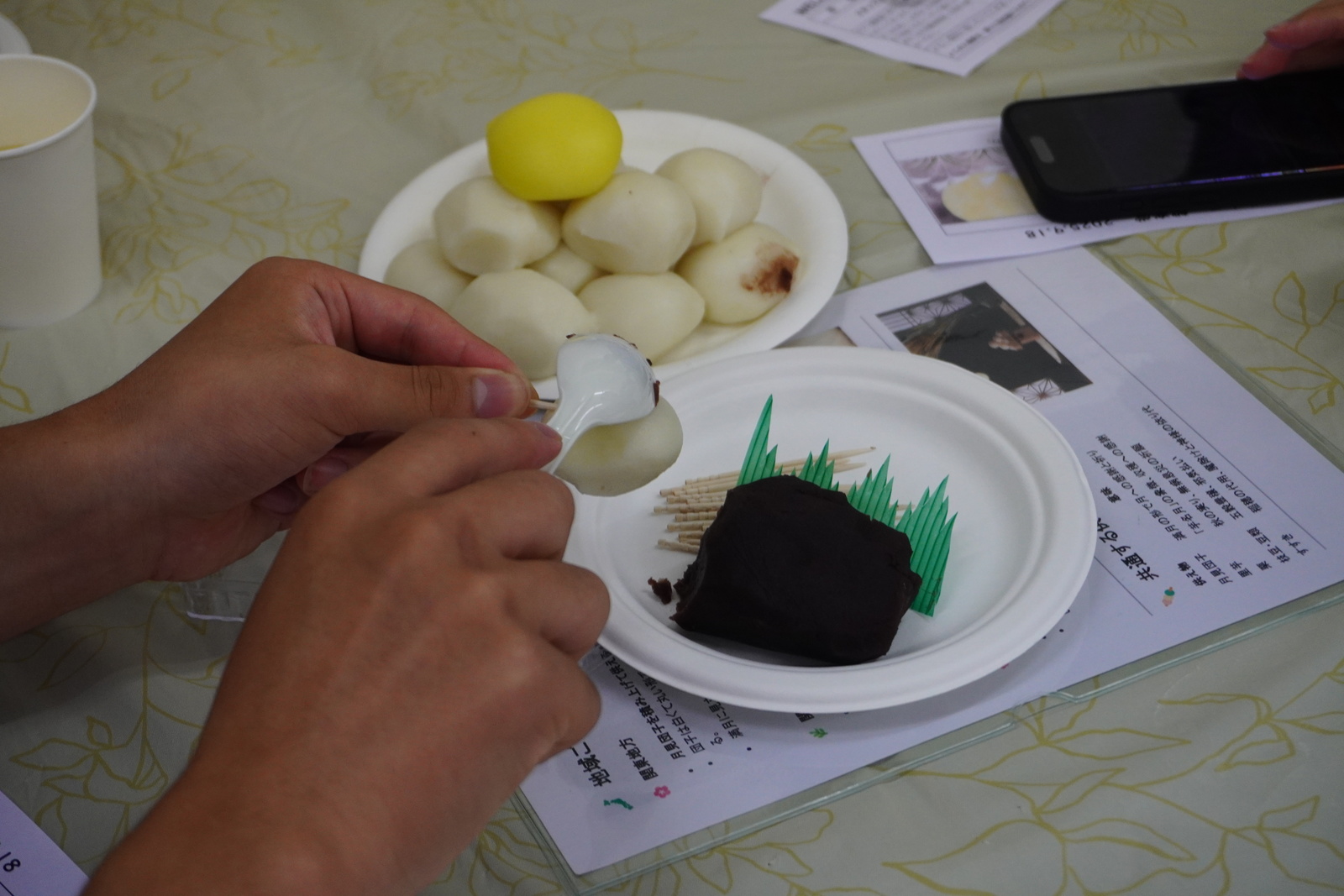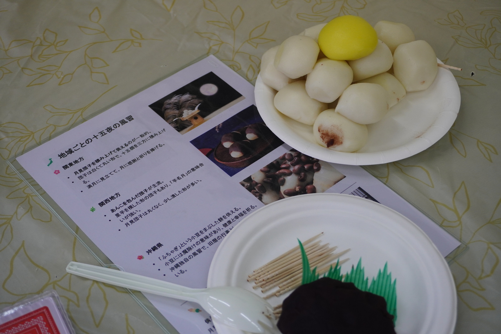 月見団子+あんこ。月見団子を初めて食べる生徒さんも多く、新鮮な体験になったようです。団子に自分であんこを付けます。
