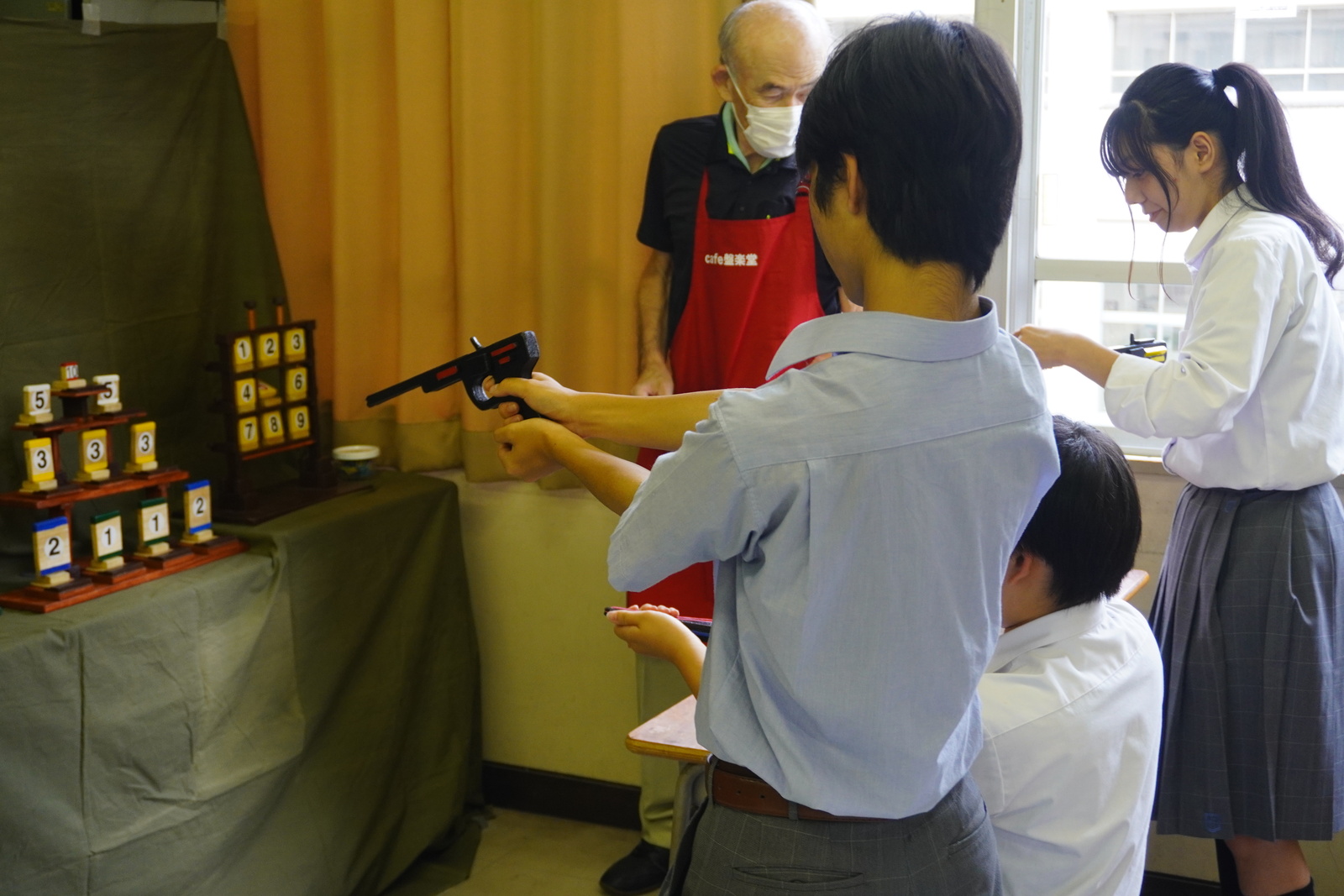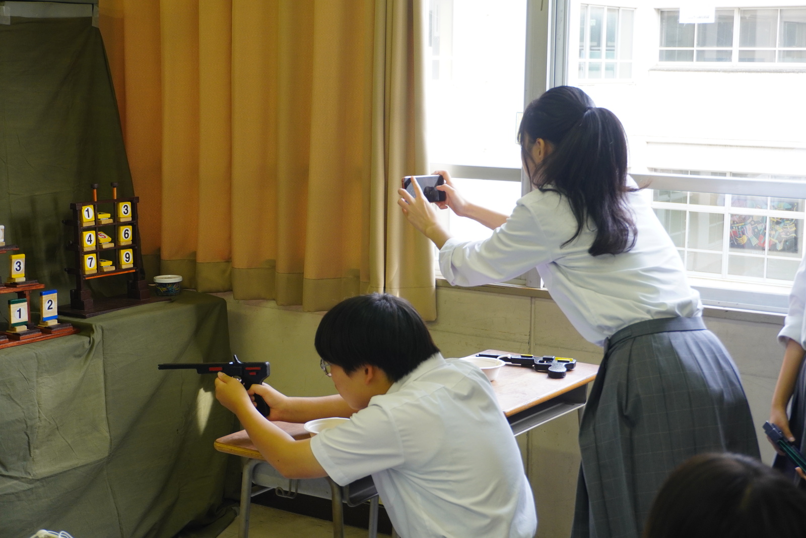 射的に挑む この射的セットはスタッフの手作りです。息を飲むような緊迫感と集中力。生徒のみなさんは、この手作りの味わいも十分感じてくれたようです。