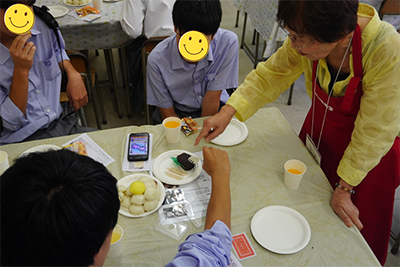 自分時間を楽しむ生徒のみなさん。スタッフから月見団子の食べ方を教わります。